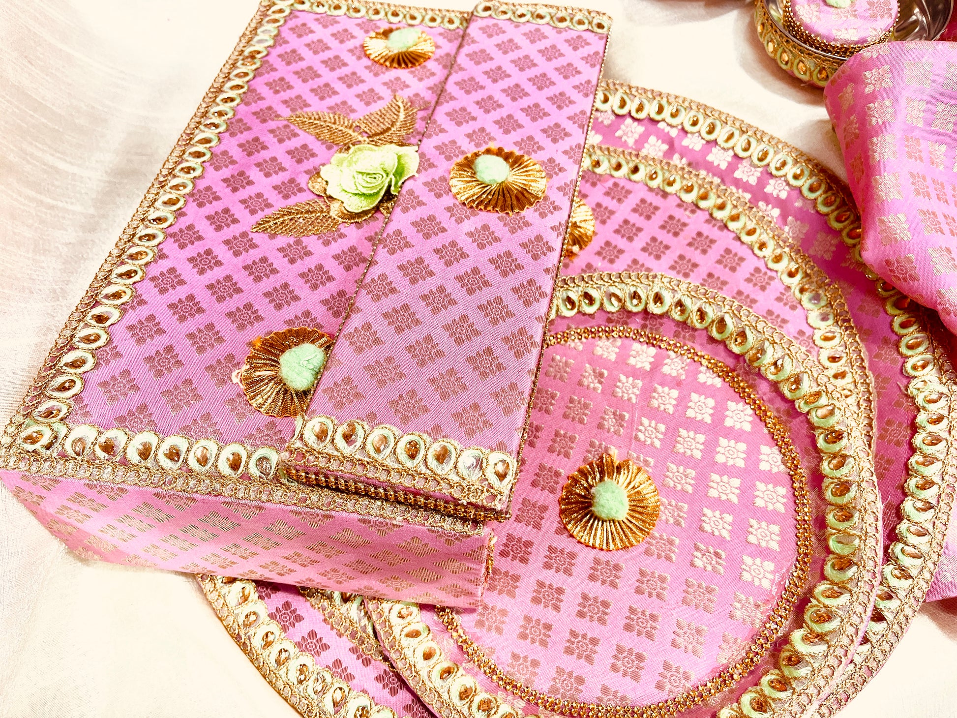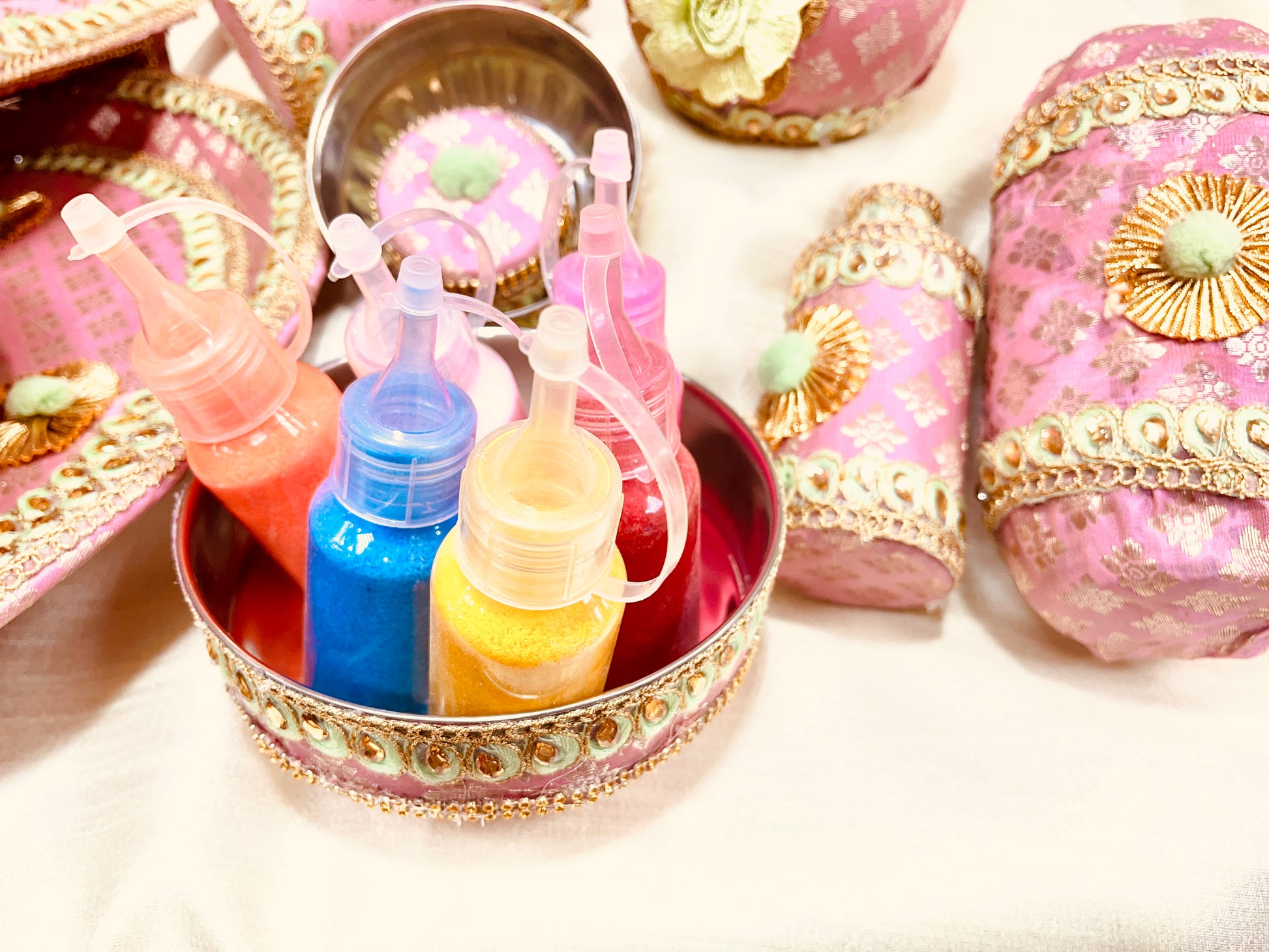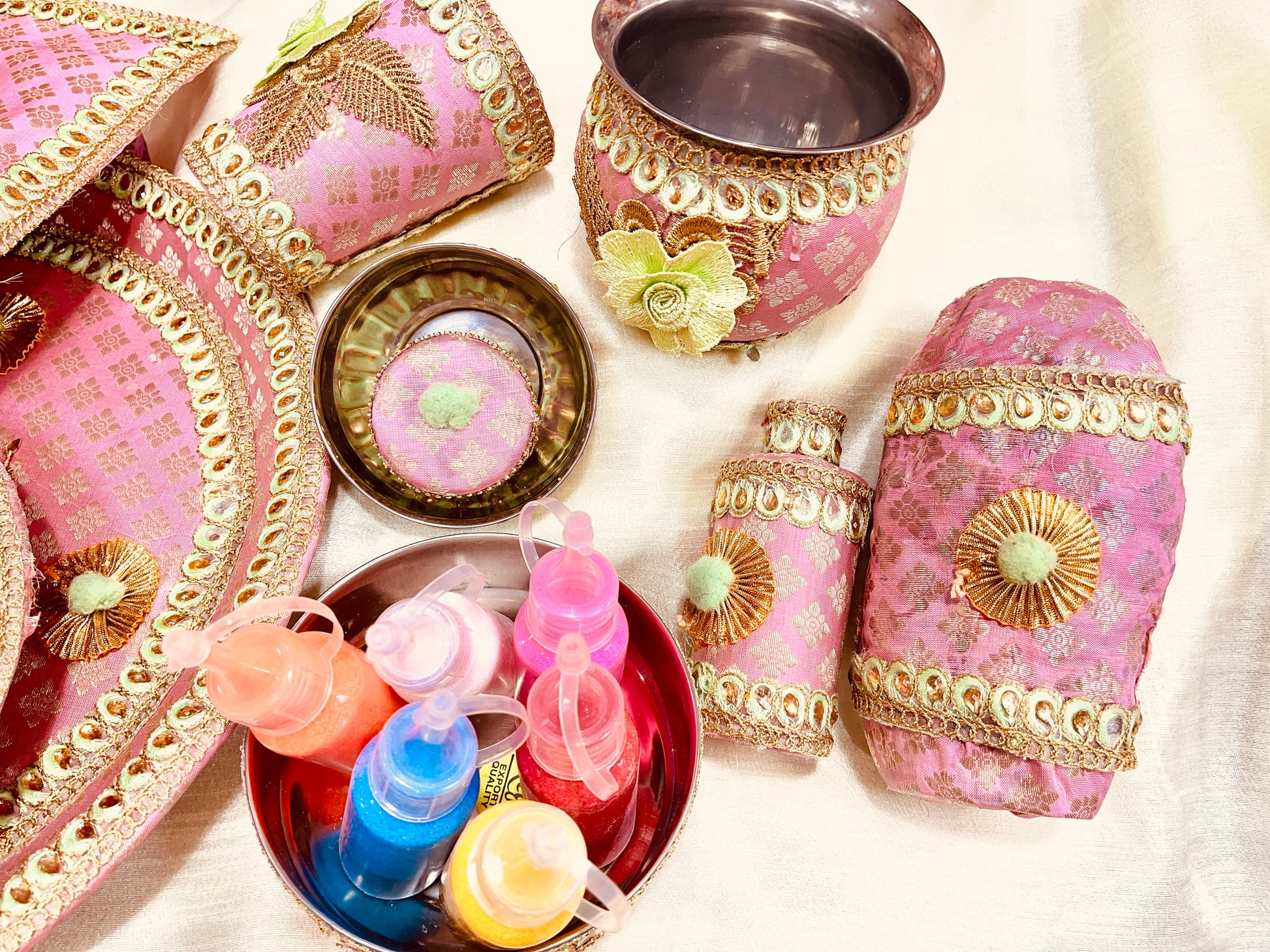 - 2 decorated bowls (small and large): covered in coordinated pink and gold brocade, used for the haldi and atta during Maiya rituals.